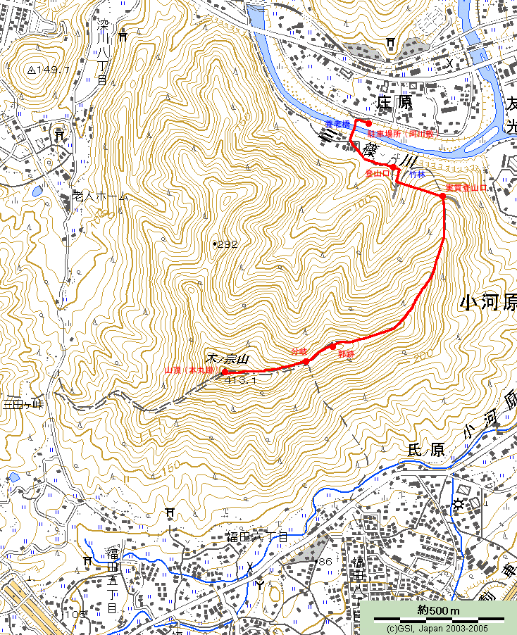 ![]() | 福田側の降り口。 急な斜面が続く。 10mくらい降りてみたが更に急な斜面が続いていた。 |