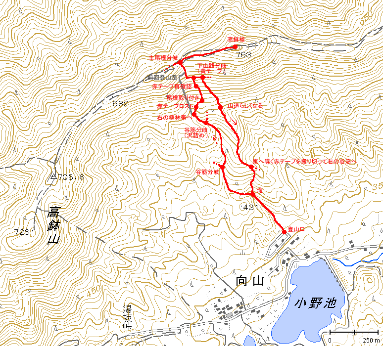赤テープを振り切って下りた谷筋は、場所も定かでなく、道でもなく、藪の増える季節はお勧め出来ません。