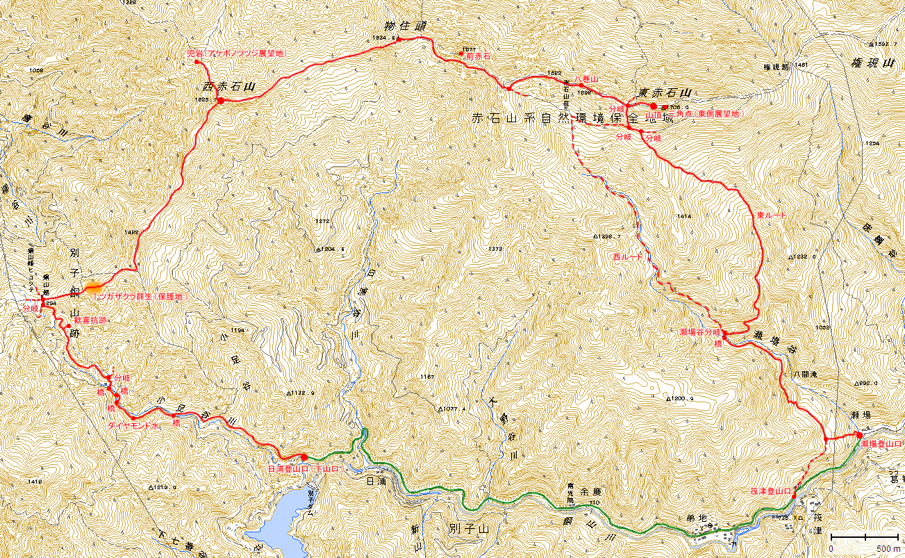 東赤石山までは、今年は瀬場(昨年は筏津)から入山、瀬場谷分岐から東ルート(昨年は西ルート)を選択、