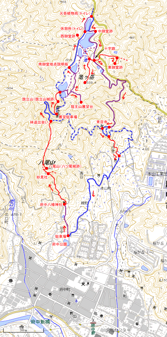 ※)ルート図の赤は山道、青は車道、紫は遊歩道(舗装路)です。