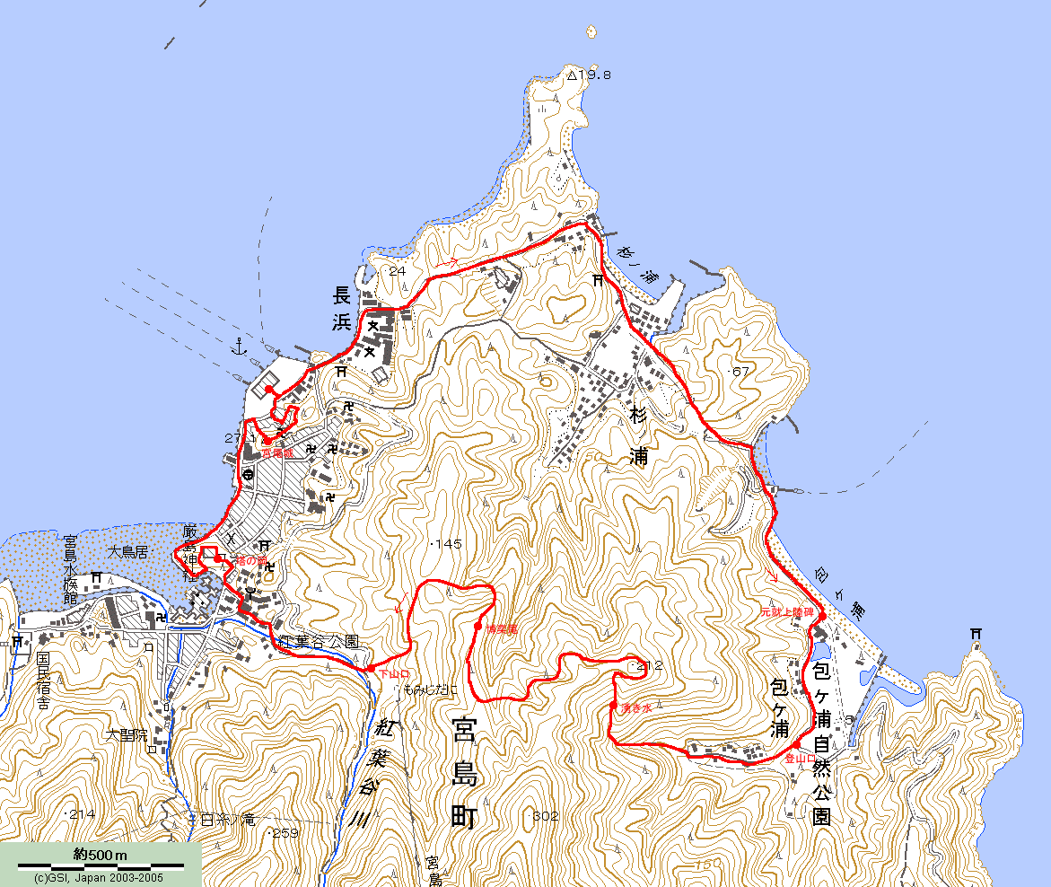 桟橋から包ヶ浦(元就上陸碑)まで歩いて35分、そこから登山口まで5分、