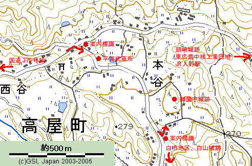 (まとめ・総評) 平賀氏の3代惟長の築城。 15代弘保が白市の白山城を築城して移り、平賀氏の200年間の拠点としての役目を終えた。 城跡の周りを1周しましたが、かなり峻険で外からの攻撃は困難でしょう。 A郭からE郭へも容易に登れず、守りの形としては理想的と言えるでしょう。 西条ICから国道375号線を北へ約2.7km、「中核工業団地」の標識を右折。 JR入野駅方面に向かう幹線道路に入り約2.8km、右に案内表示を見て右折。 100mで左に「平賀氏の墓」、更に400~500mで左に案内表示を見て左折。 すぐ左手奥に写真1枚目の案内板が見えます。 案内板前に数台駐車可能です。 案内板を右に行くと、すぐA郭B郭が左手に見えます。 E郭へは、A郭B郭を見過ごして直進して外側から登るか、本文で説明した方法で登ります。 | |
