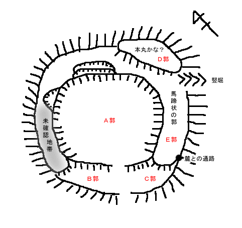![]() | A郭をぐるっと廻りましたが、 E郭に登る道がありません。 北東側の土塁が比較的低かったので、 ここをよじ登りました。 E郭からD郭を見上げる。 |
