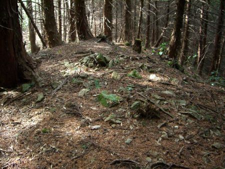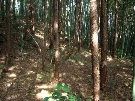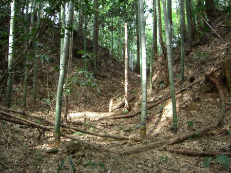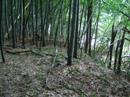 ![]() | 二の丸の北下にある土塁?(郭?) 岩が散乱している。石塁跡か?... この辺り(二の丸、本丸の北側)は起伏が激しく、 土塁や通路になっているのかな?... |