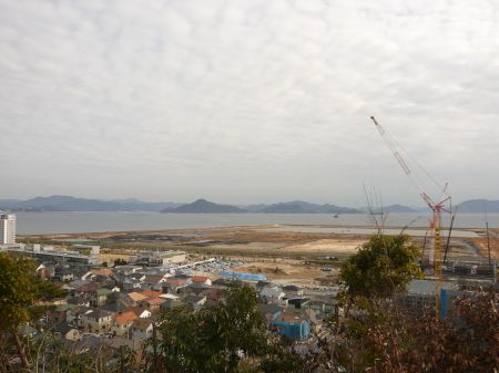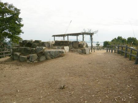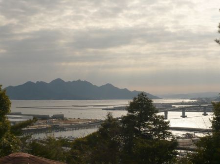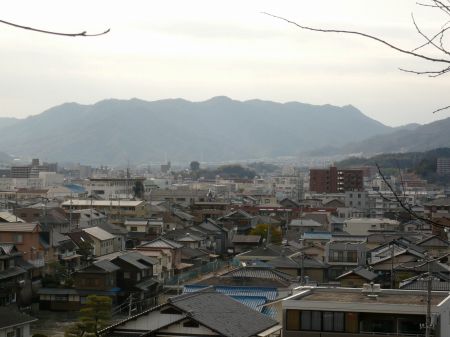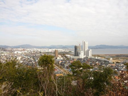 ![]() | 主郭から東側の展望。 中央奥にかすかに仁保島城跡が見えます。 |