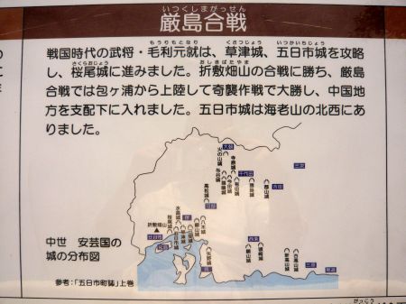 (まとめ・総評) 厳島合戦の折り、陶軍に攻められた宍戸氏の城で、本城から西1kmにあった五日市城の属城。 北側はほぼ公園化されて原型をとどめていませんが、南側は一部石垣跡や、郭、竪堀らしき跡が見られる。 今は住宅地の中にいきなり現れる丘陵地ですが、当時(中世)は海に囲まれた小島だった様です。 国道2号線を西進すると、JR五日市駅を過ぎてすぐ左手に見える丘陵地が海老山城跡です。 商工センター内を西進すると、商工センター西端の新八幡川橋を渡り、700m先で右手に見える丘陵地です。 (こちら側からはビルや学校が建設中で丘陵地は見えにくくなっています。) 私は近所の親戚の家から徒歩で行きましたが、 北側から車道が登っているらしいので、そこに駐車場があるのではないでしょうか。 | |
