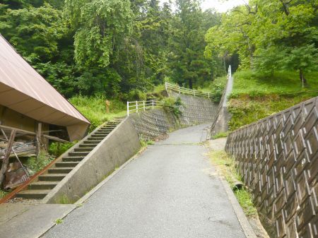 踏切から200mちょっとで大きく右カーブする手前左の階段から入山する。