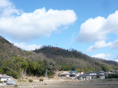 ![]() | 仁井山城跡全景。(南西側より) 主郭に鯉幟が見えます。 |