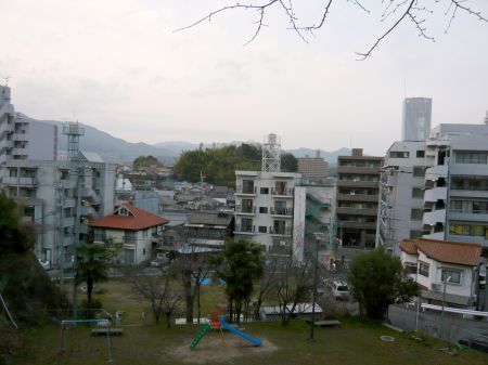 ![]() | 市内方面の展望。 当時はこの辺りは全て海でした。 中央右寄りに仁保島城跡(黄金山)。 |