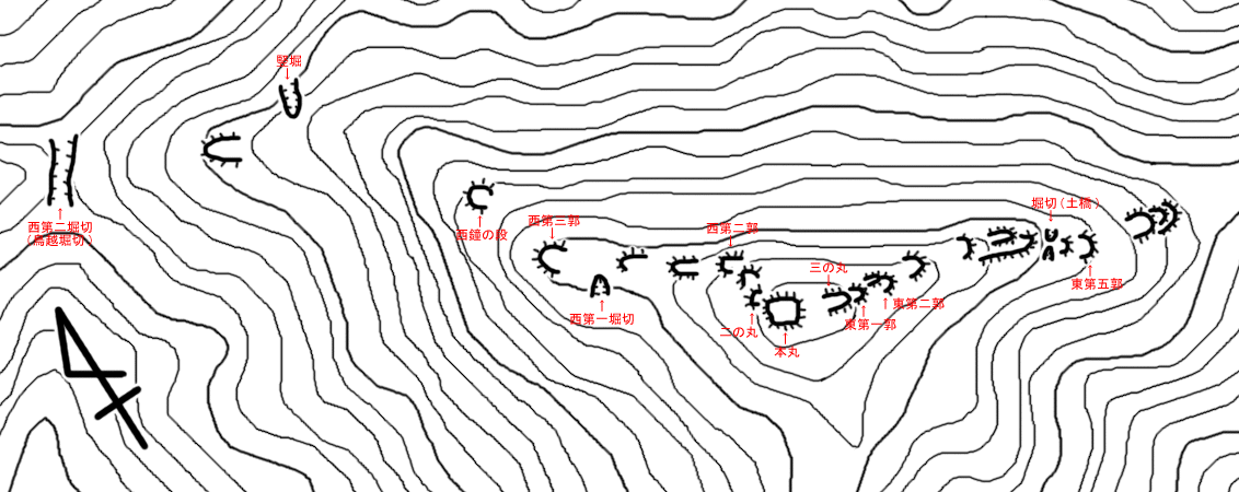 本城は、牛頭山の西峰を中心に東西鞍部までの広範囲に、多くの郭、堀などを配してます。