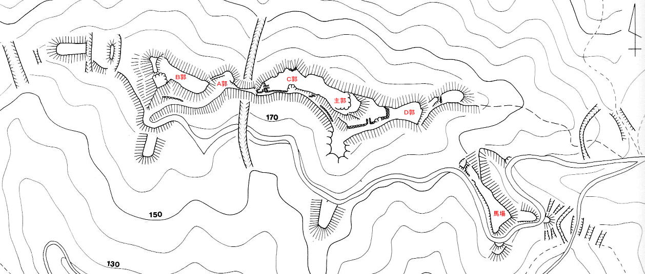 起点のA郭から、西郭群のB郭、東郭群のC郭→主郭→D郭、