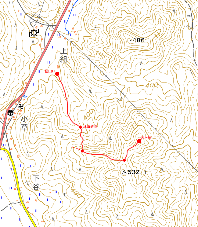国土地理院の地図では、世羅町伊尾の三角点のある532.1m峰の隣の名も無い峰。